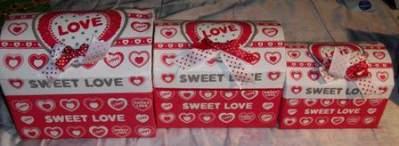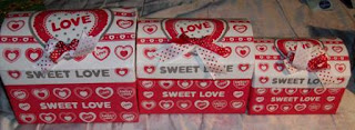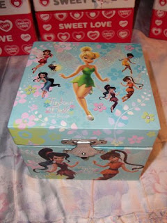 Caixinhas todas encaixadas umas nas outras, com uma carta, uma rosa (ver em baixo) e uma caixinha de música da Sininho, da Disney. :)