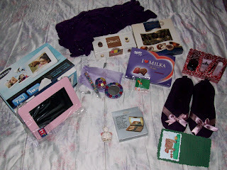 - Conjunto de manicure (creme para as unhas, creme para as mãos, removedor de cutículas e lima com quatros faces), sabrinhas roxas com lacinho rosa para andar em casa e postal feito à mão ofertados pela minha melhor amiga;