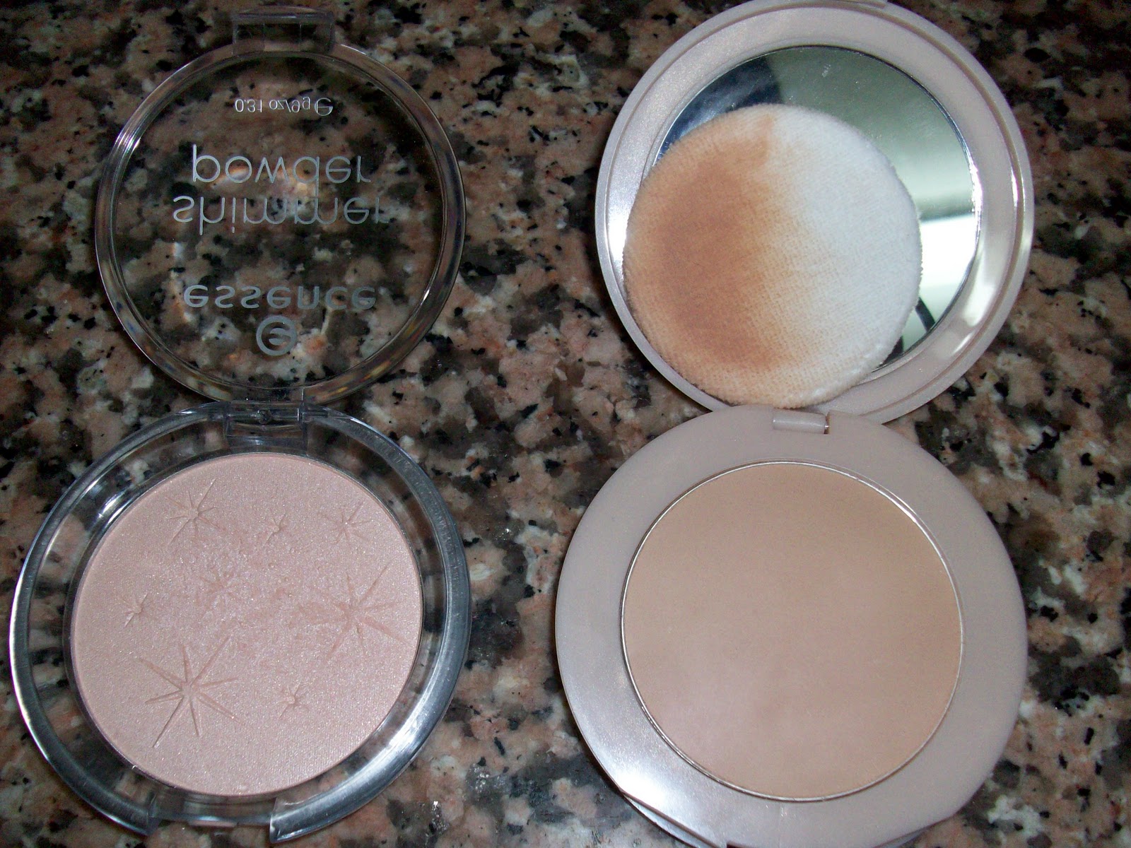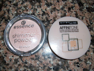Shimmer powder da Essence e Affinitone da Maybelline. Uso o primeiro quando saio à noite, porque deixa pequenos brilhantes na cara e no pescoço (I JUST LOVE IT!). O segundo, ofertado pela Maybelline, é utilizado no dia-a-dia, quando aplico base. Gosto bastante de ambos.
